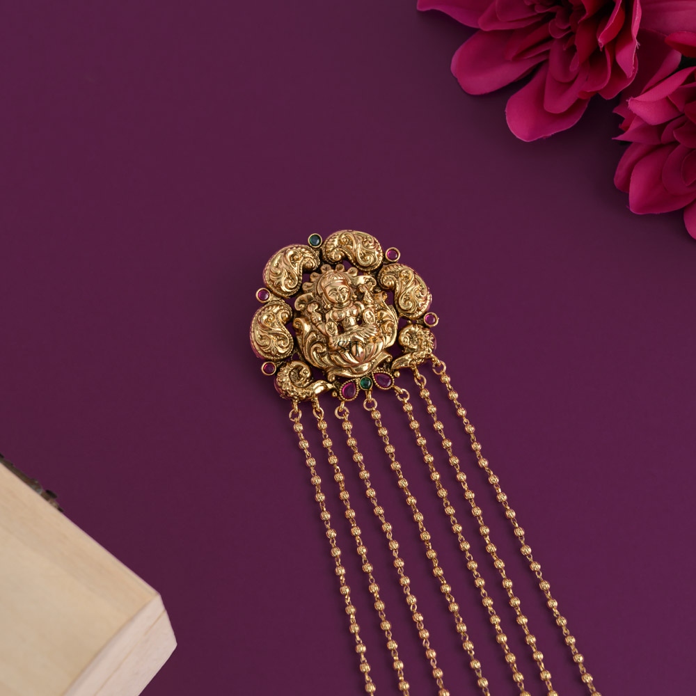 The Lakshmi gold beads hanging Jadai Billai is a classic bridal hair accessory that beautifully highlights South Indian traditions. Designed with small gold beads and Lakshmi motifs, it is made to adorn the braid, giving it a graceful and complete look. Brides often choose this style to reflect heritage and devotion while adding elegance to their wedding attire.