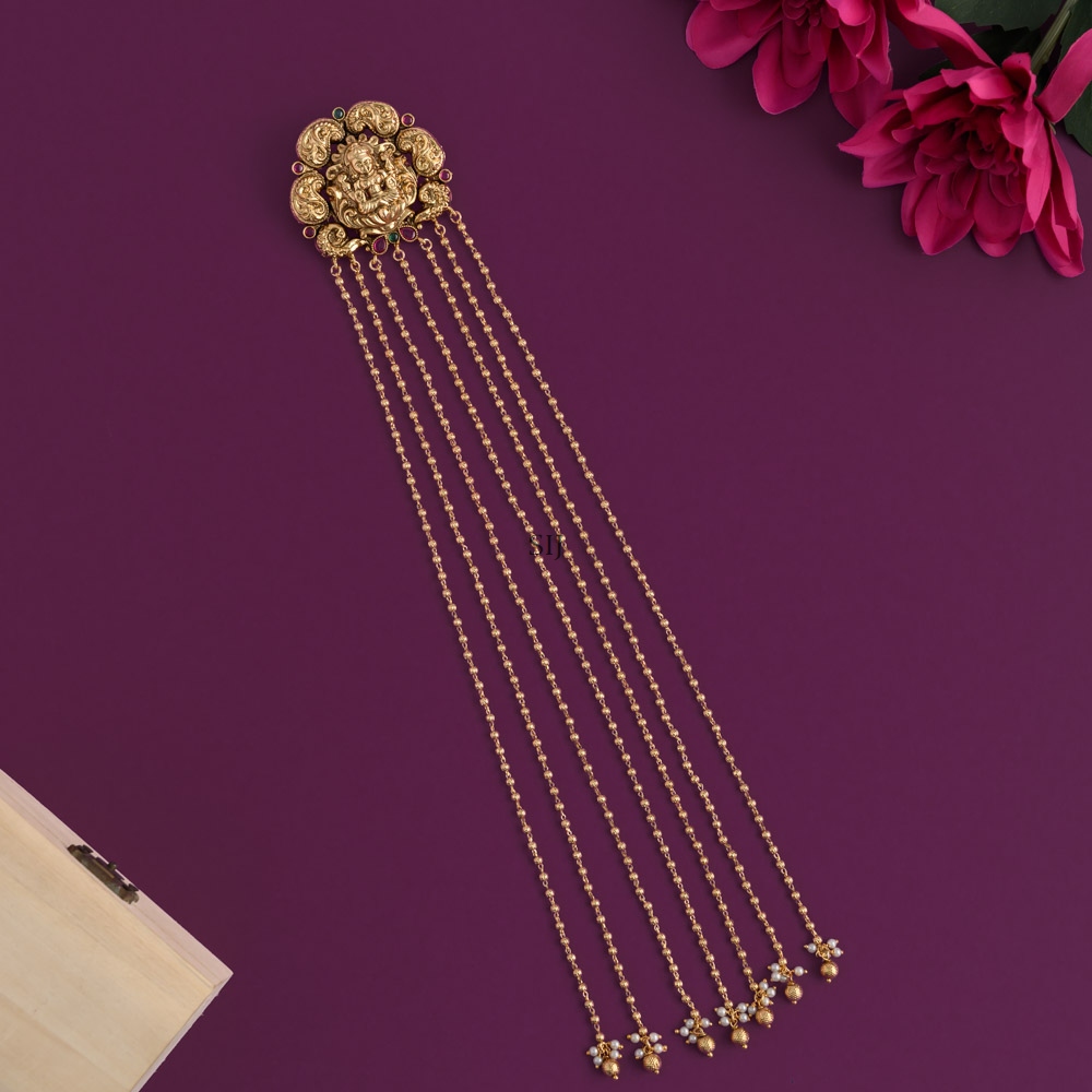 The Lakshmi gold beads hanging Jadai Billai is a classic bridal hair accessory that beautifully highlights South Indian traditions.