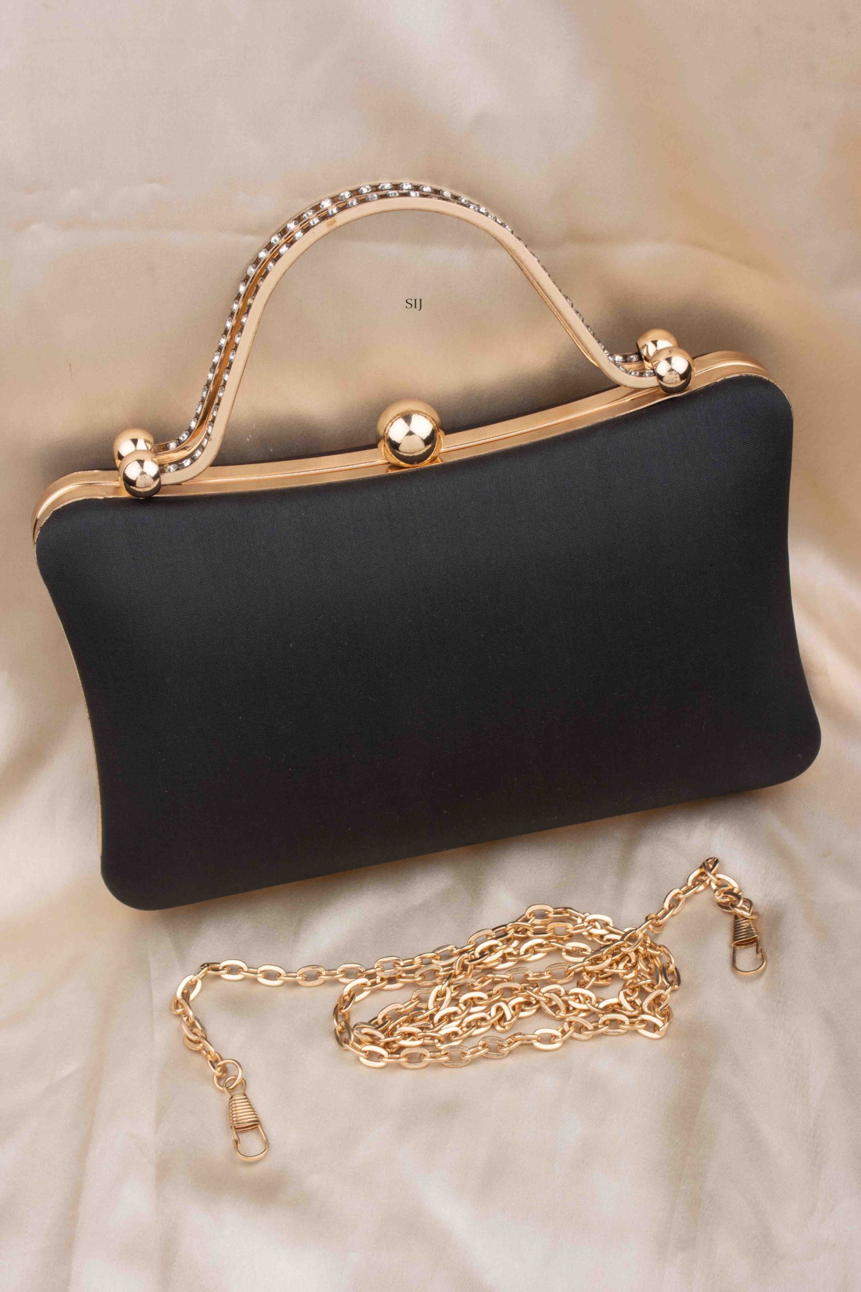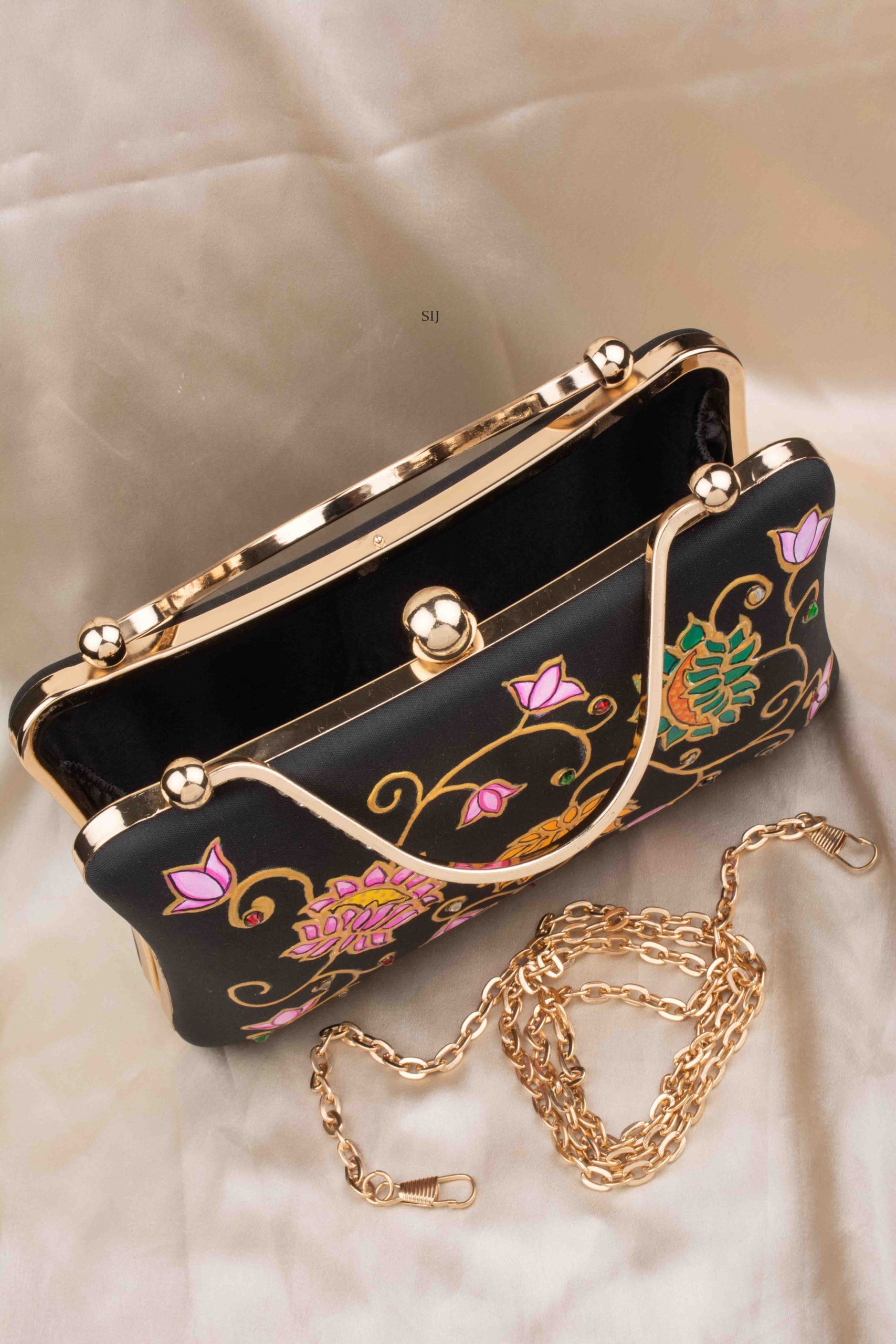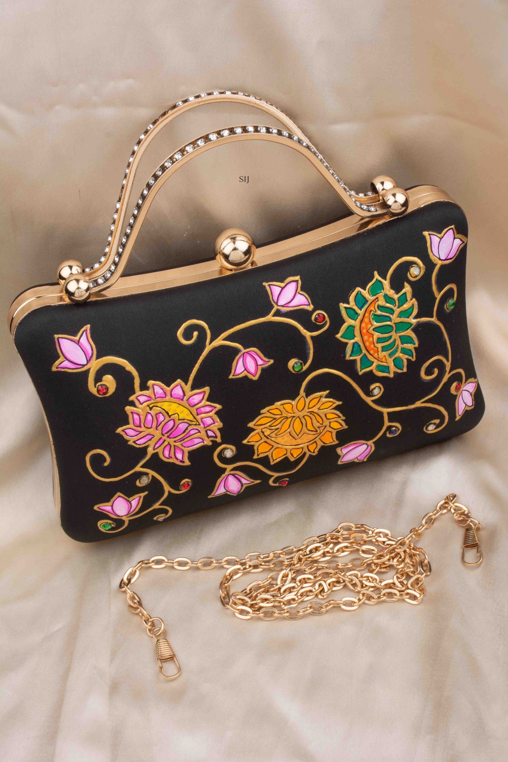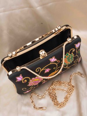 The Tanjore Painted Pure Black Silk Clutch Bag is a graceful accessory that blends art and tradition.